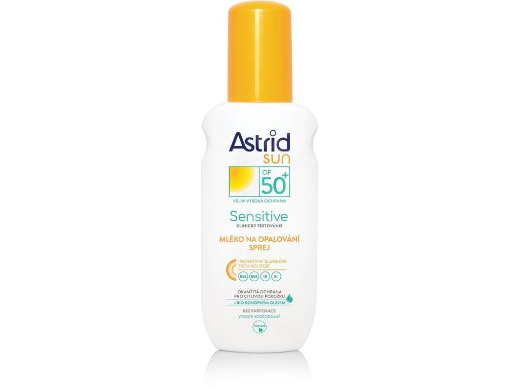ASTRID SUN Mléko na opalování ve spreji pro citlivou pokožku OF 50+ s inovativní sluneční technologií (UVA/UVB/IR/VL) okamžitě poskytuje pokožce velmi vysokou širokospektrální fotostabilní ochranu před škodlivými vlivy UV a infračerveného záření a viditelného světla.