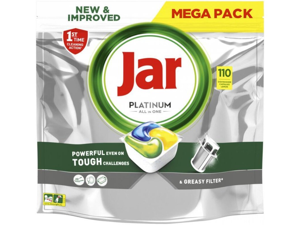 - JAR Platinum Plus tablety 110 ks, tablety, které se nerozbalují, účinek již při 40°C, tekutá část kapsle se silným odmašťujícím účinkem, obsahuje již oplachovač, nádobí zanechá lesklé, změkčující sůl zanechá sklo beze skvrn, prášková část kapsle má funkci namáčení, její rychlá rozpustnost zajistí dokonalé odstranění odolných skvrn i od čaje. Navíc pomáhají při odstranění zašedlosti nádobí - účinné na usazený vodní kámen na nádobí.