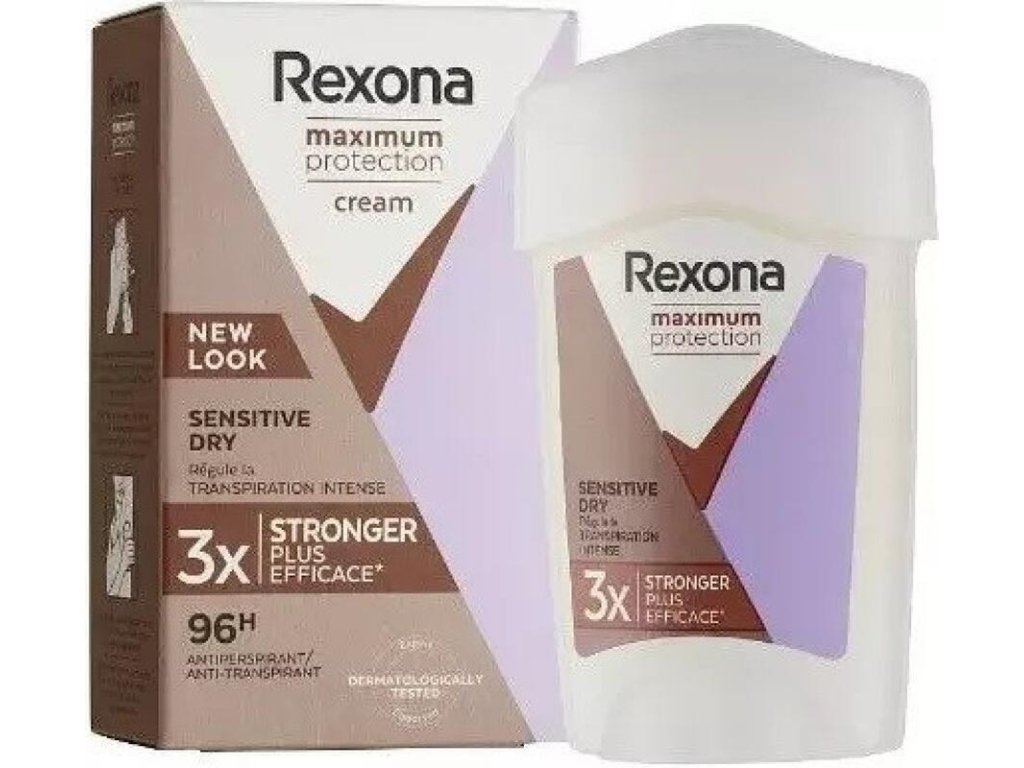Tuhý deodorant Woman Maximum Protection Sensitive Dry s obsahem inovativní technologie TRIsolid, která reaguje na tělo a obsahuje tři důležité složky: dosud nejúčinnější ochranu proti pocení od Rexony, technologii s mikrokapslemi bojující proti nepříjemnému zápachu a složku pro hydrataci pokožky.